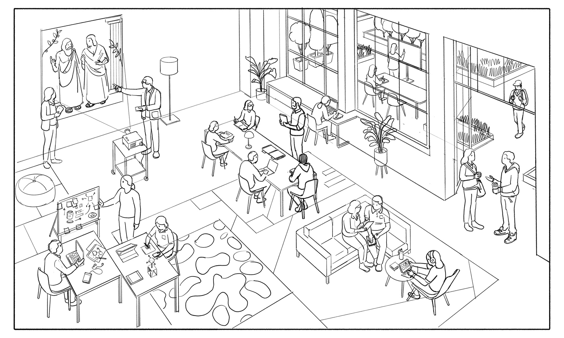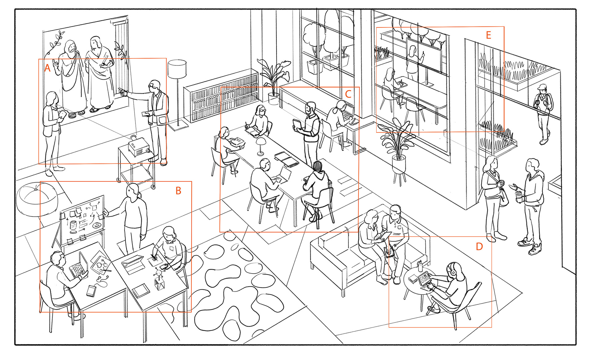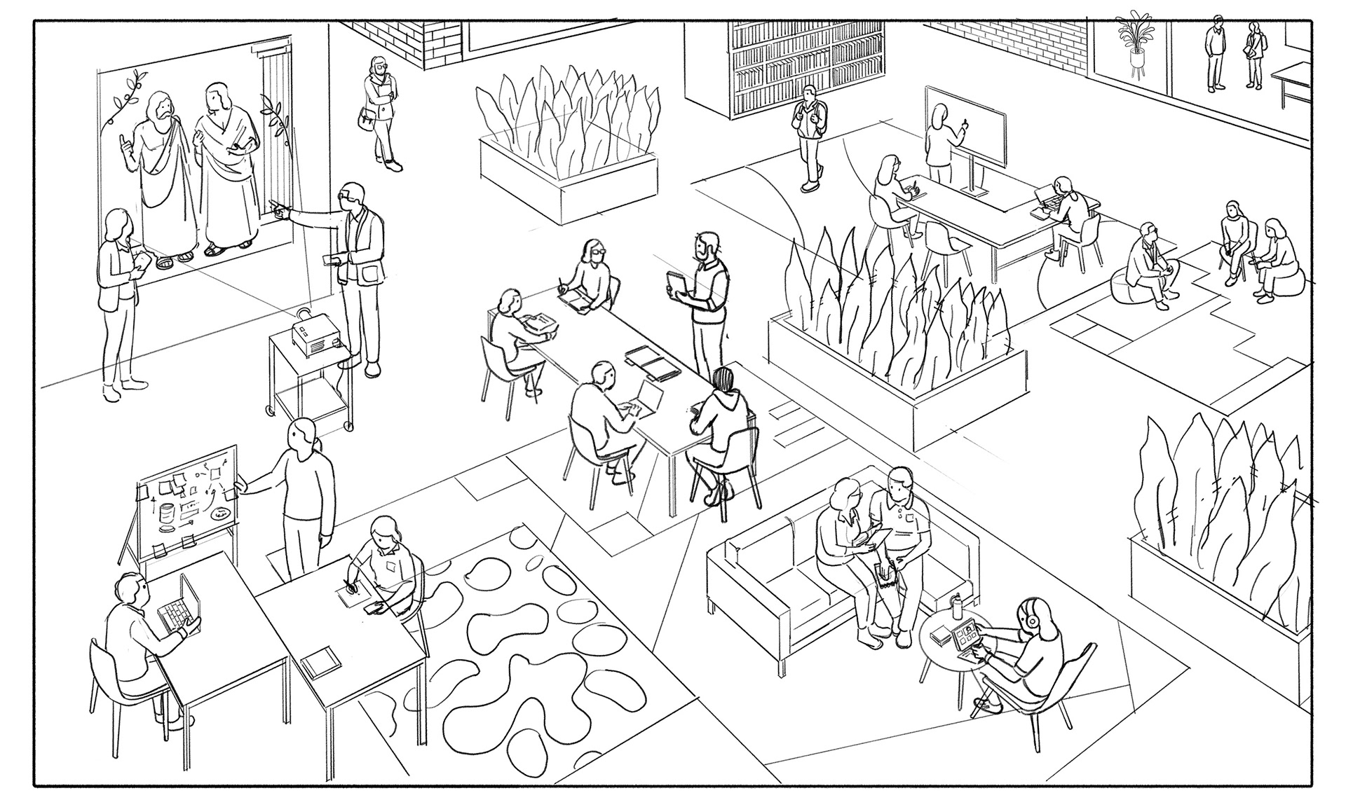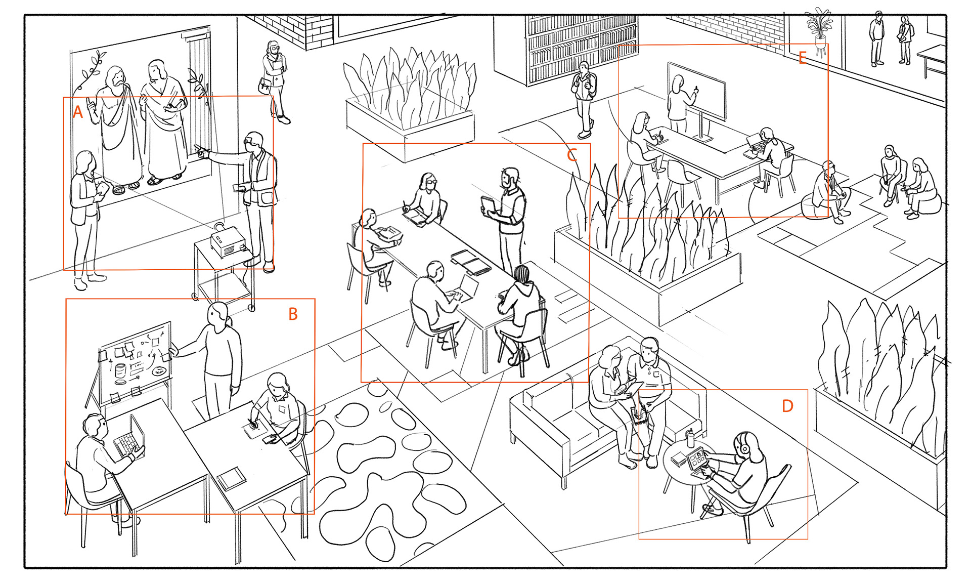 My illustration was designed as part of the visual system for the project, using an axonometric viewpoint to create depth and clarity across a complex scene.