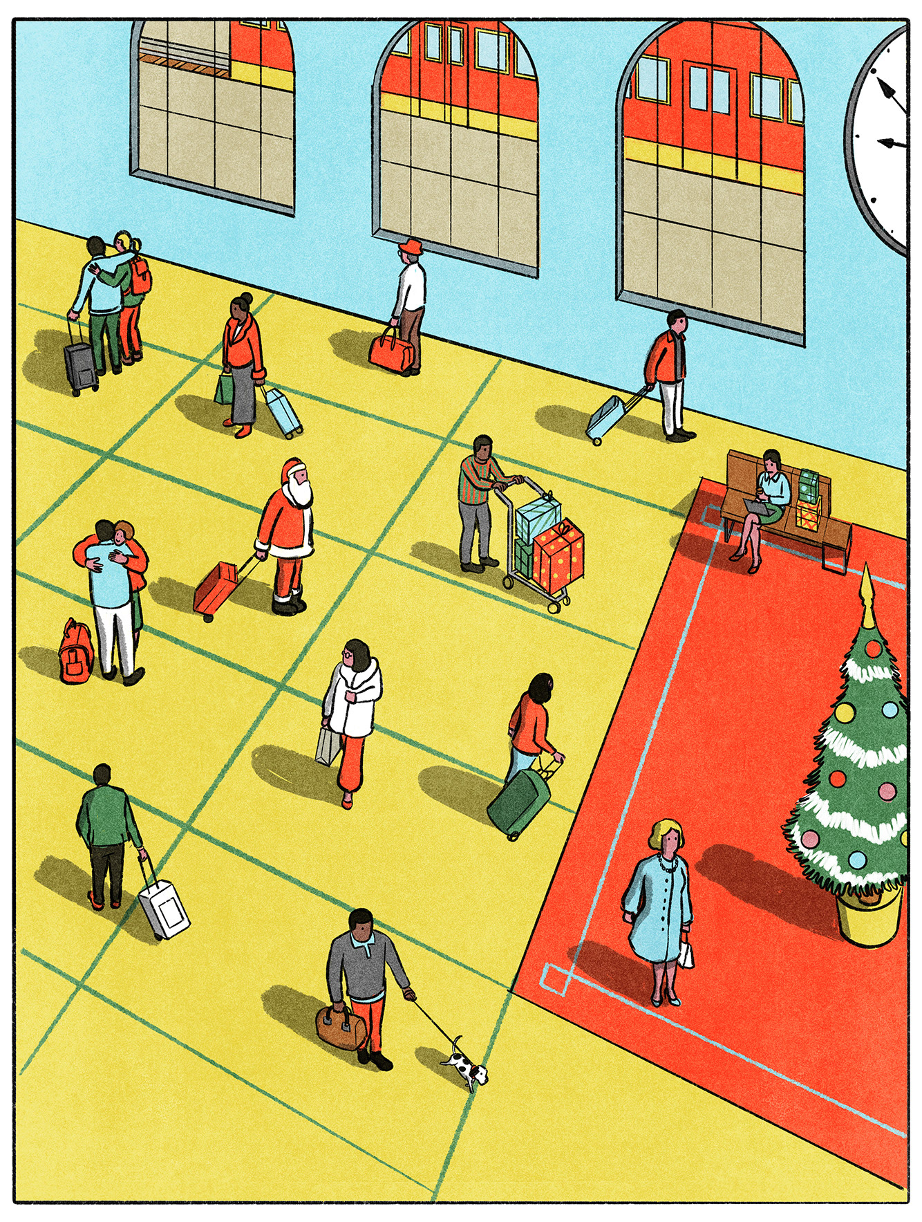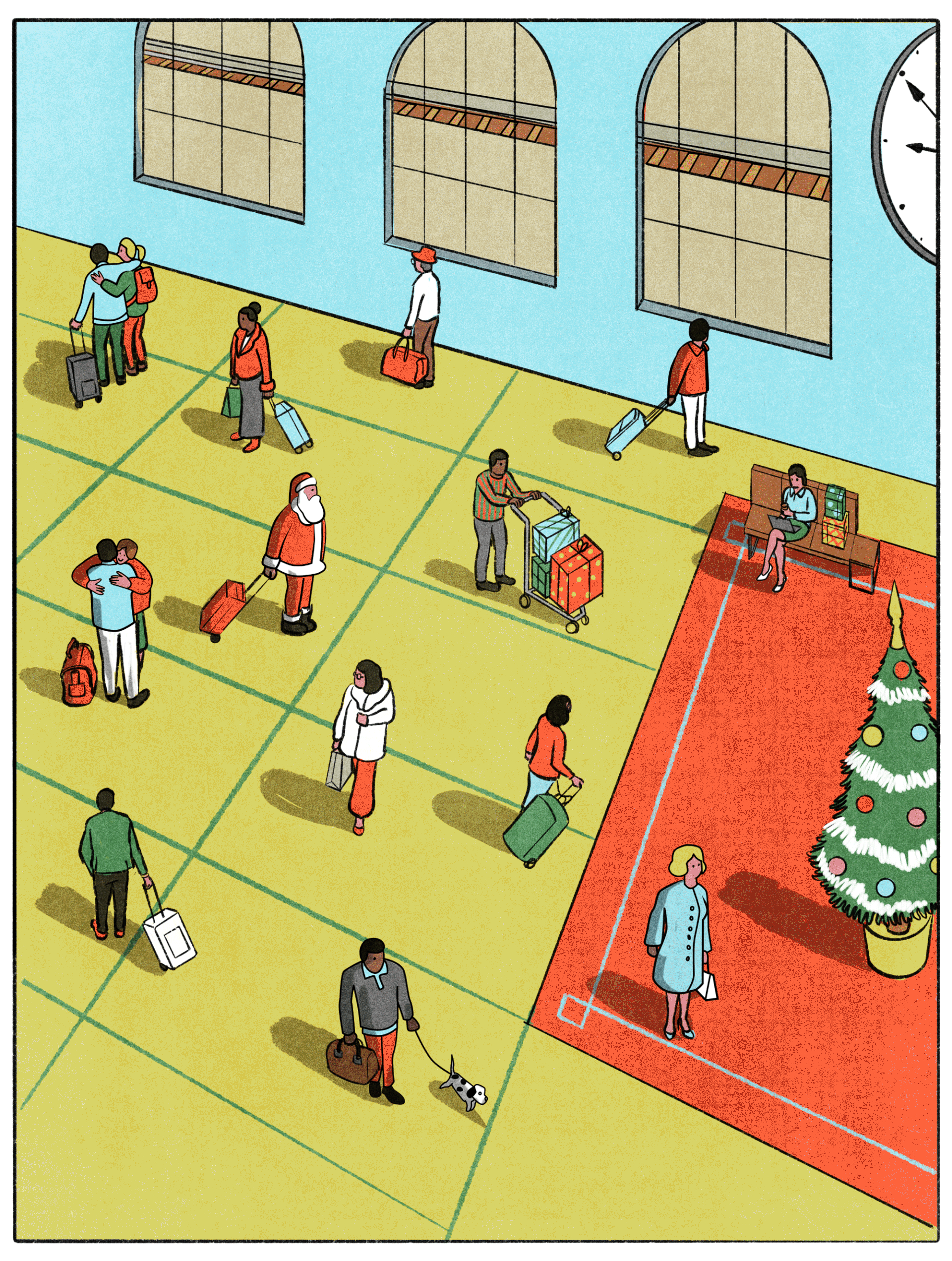 The artworks capture the festive, urban rhythm of the season — scenes of travel, shopping, and celebration — with a refined, mid-century inspired aesthetic and clean composition.